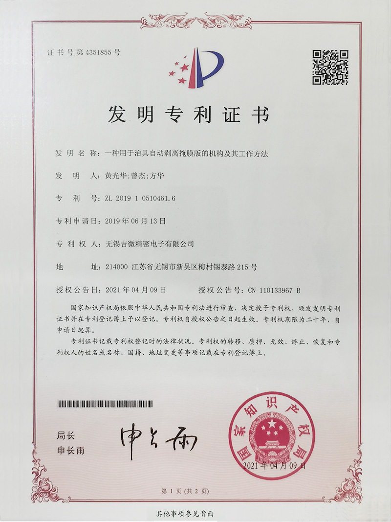一種用于治具自動(dòng)剝離掩膜版的機(jī)構(gòu)及其工作方法發(fā)明專利證書