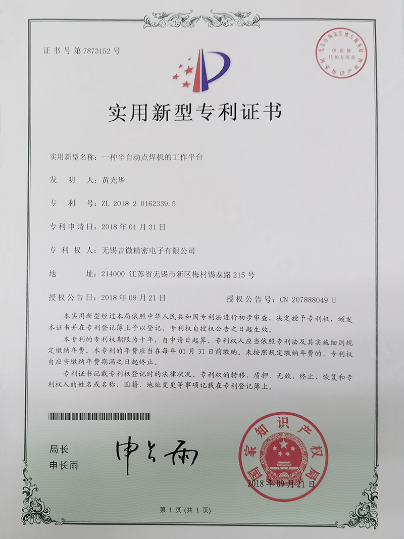 一種半自動點焊機的工作平臺實用新型專利證書